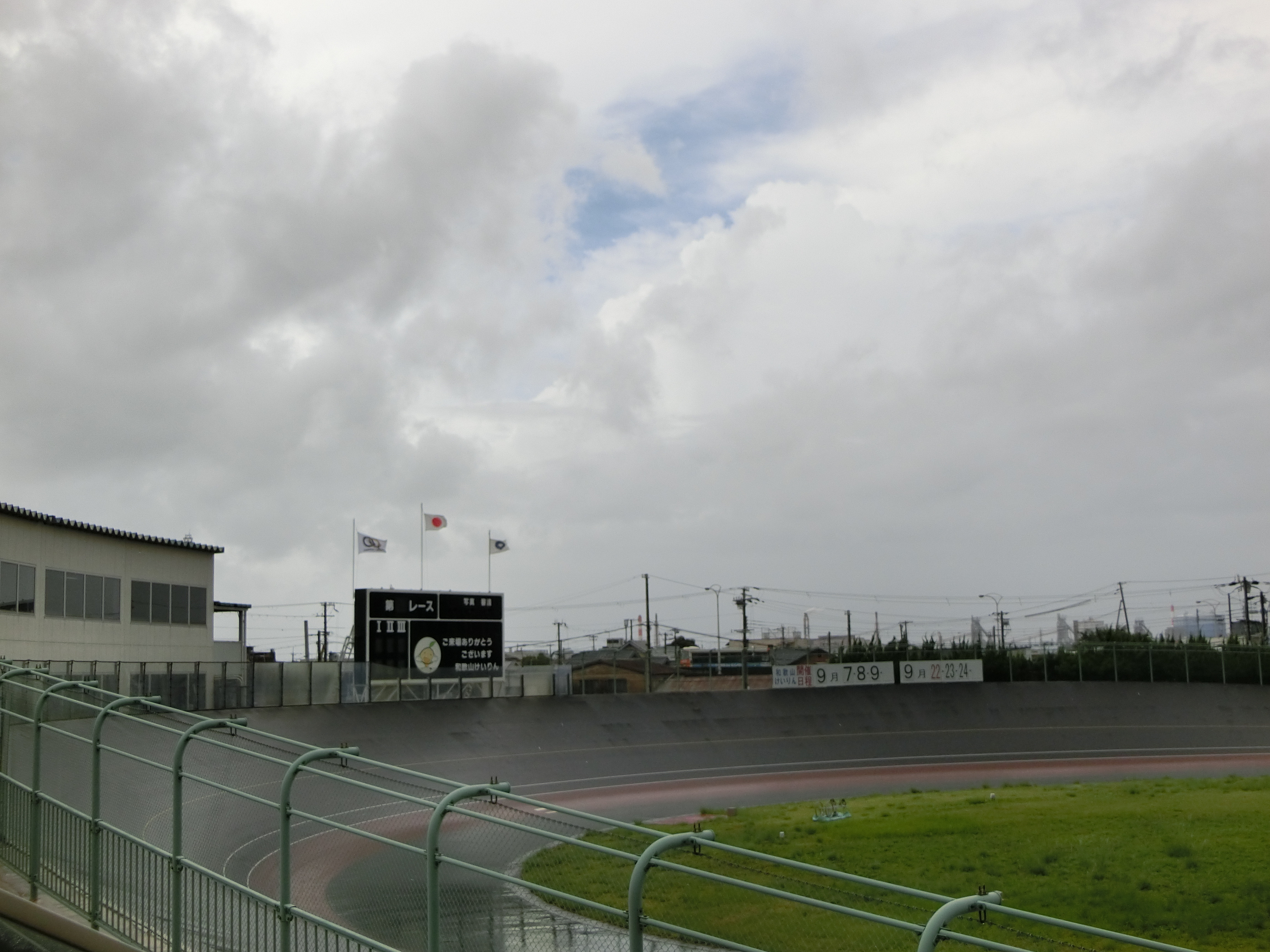 台風10号が沖縄・奄美地方に被害を残し、さらに九州西海岸に沿って北上を続ける中、開催初日がやってきました。開催の態度決定がされるAM7時過ぎに、眠い目をこすりながら和歌山競輪HPやテレドームで確認すると「中止」の告知はなく、ホッとひと安心。そしていつもより早く出社。というのも今回の開催は、ガールズのレースが初日・2日目は1R・2Rに配置されており、1Rが10時40分とこれまでの和歌山ガールズ開催の中で最も早い時間のガールズレース発走時刻になっていたからです。