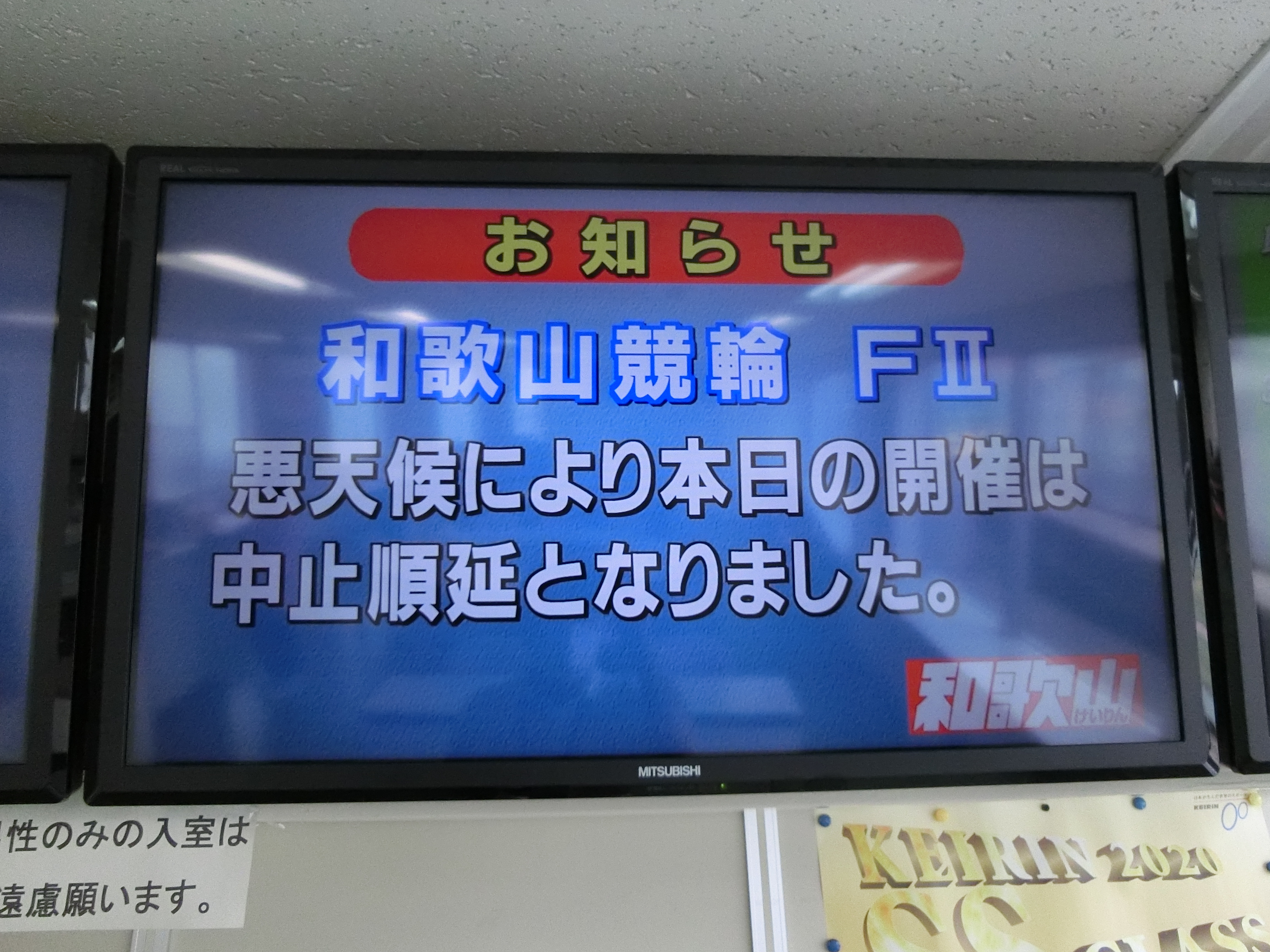 ところが記者室に入るなり、スポーツ紙の記者さんらが「大変や、大変や」の嵐。「どないしたんですか?」と尋ねると、「山本っちゃん、今日中止になったんや?」。それでも場内のオッズモニターには1R・締切5分前のオッズが写っていましたし、何かの悪い冗談かとも思いました。無理すれば開催強行できそうな雰囲気ではありました。ところが5分前にもかかわらず、締切音楽が鳴っていません。そうしている内に、場内放送で「天候悪化のため、和歌山本場は中止になりました」の告知が。続けて本場開催分のオッズモニターが全て「開催中止」の告知画面に切り替わりました。