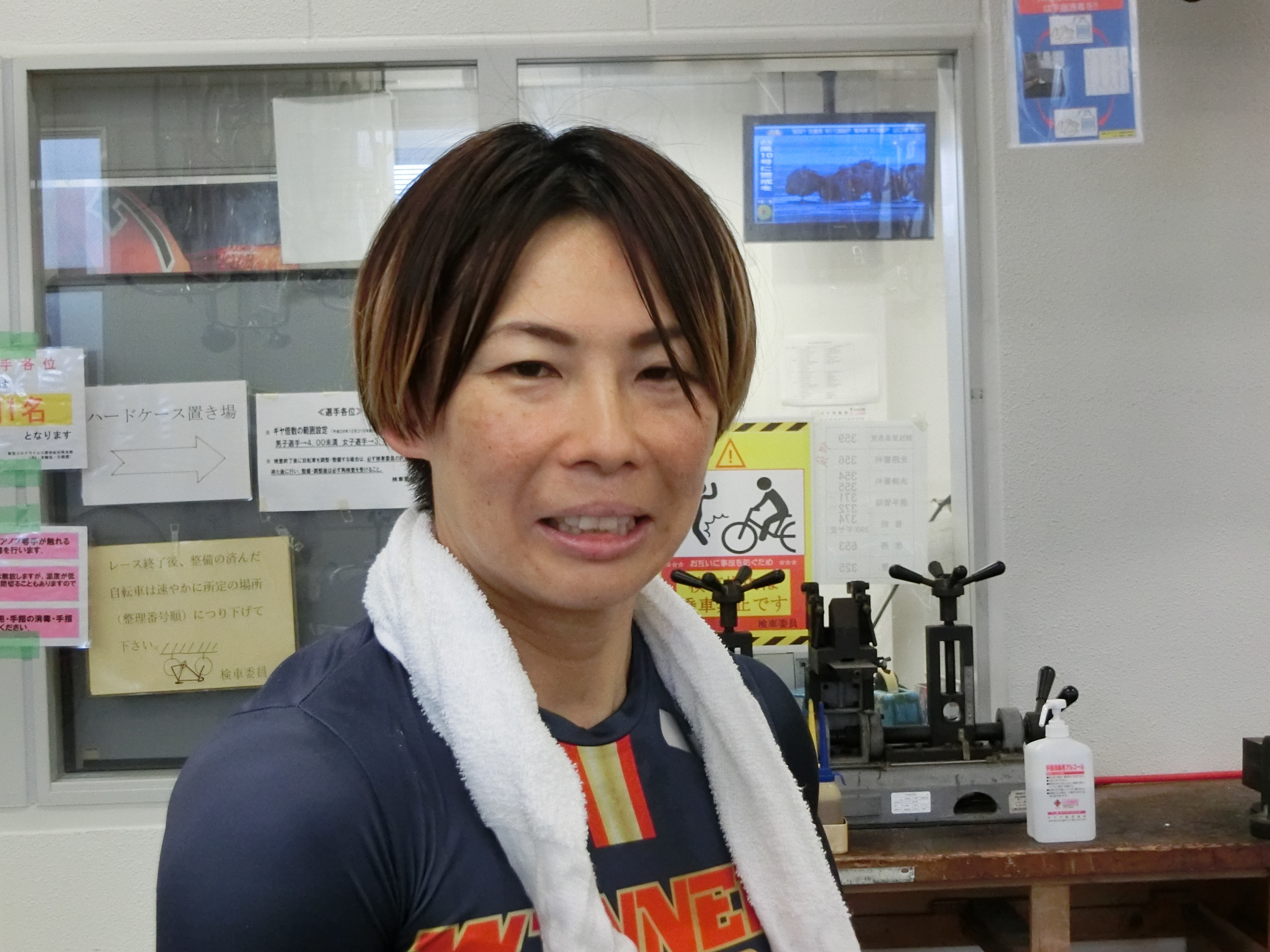 1R5番車で出場予定だった宮地選手は、こちらも「順延は初めてです」とのこと。ただ順延したことで「昨日想定した展開が、バンクコンディションが変わることで、展開そのものも変わって来そうなんで、組み立て直しかもしれないです」と、軌道修正の必要性も訴えていました。そして取材陣は、前検日のJuice=Juiceのポーズを再度おねだり。私は普通にガッツポーズをお願いしました。