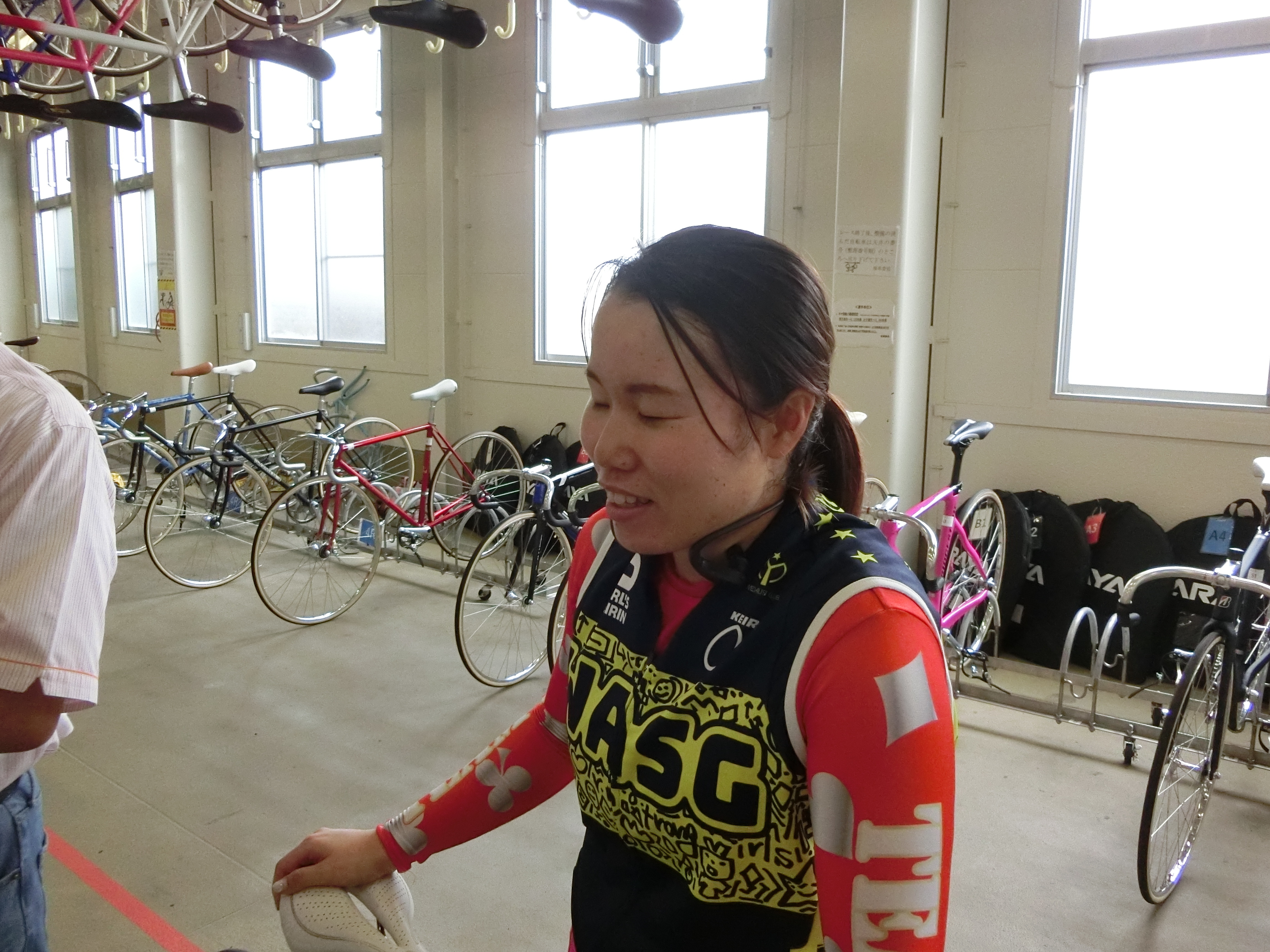 しかも当初の番組表の1番車と2番車を入れ替えるとのこと。男子レースはそれほどでもありませんが、ガールズレースは、ある意味枠順も大切な選手の作戦・レース予想のファクターです。やはり目に付いたガールズ選手に記者さんらが囲み取材を仕掛けますが、私もその輪の中に加わって話を聞きます。