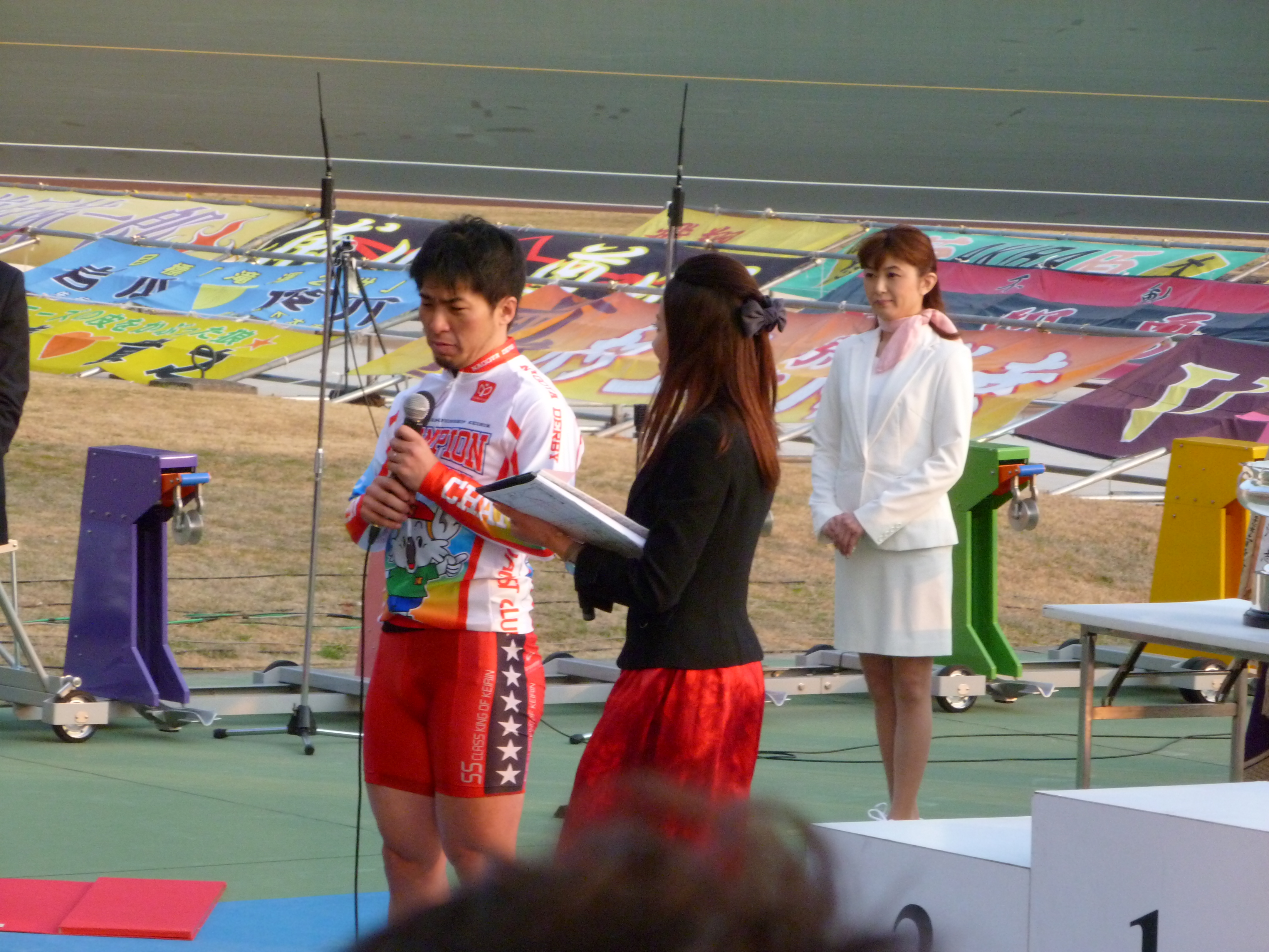 レース終了後、バンク内で表彰式が行われるとあって、私も東スタンド(3〜4コーナースタンド)から移動。今回は、一般ファンをバンク内に入れて一緒に優勝選手を祝福しようという趣向です。30m線付近の入り口からバンク内に入場する訳ですが、私が並ぼうとしたところ、最後尾はなんと1センター手前。おそらく500人くらい(あるいはそれ以上)のファンが並んでいたでしょうか。それも当然です。優勝したのが、輪界で最もファンの支持を集める村上義弘選手だったからでしょう。